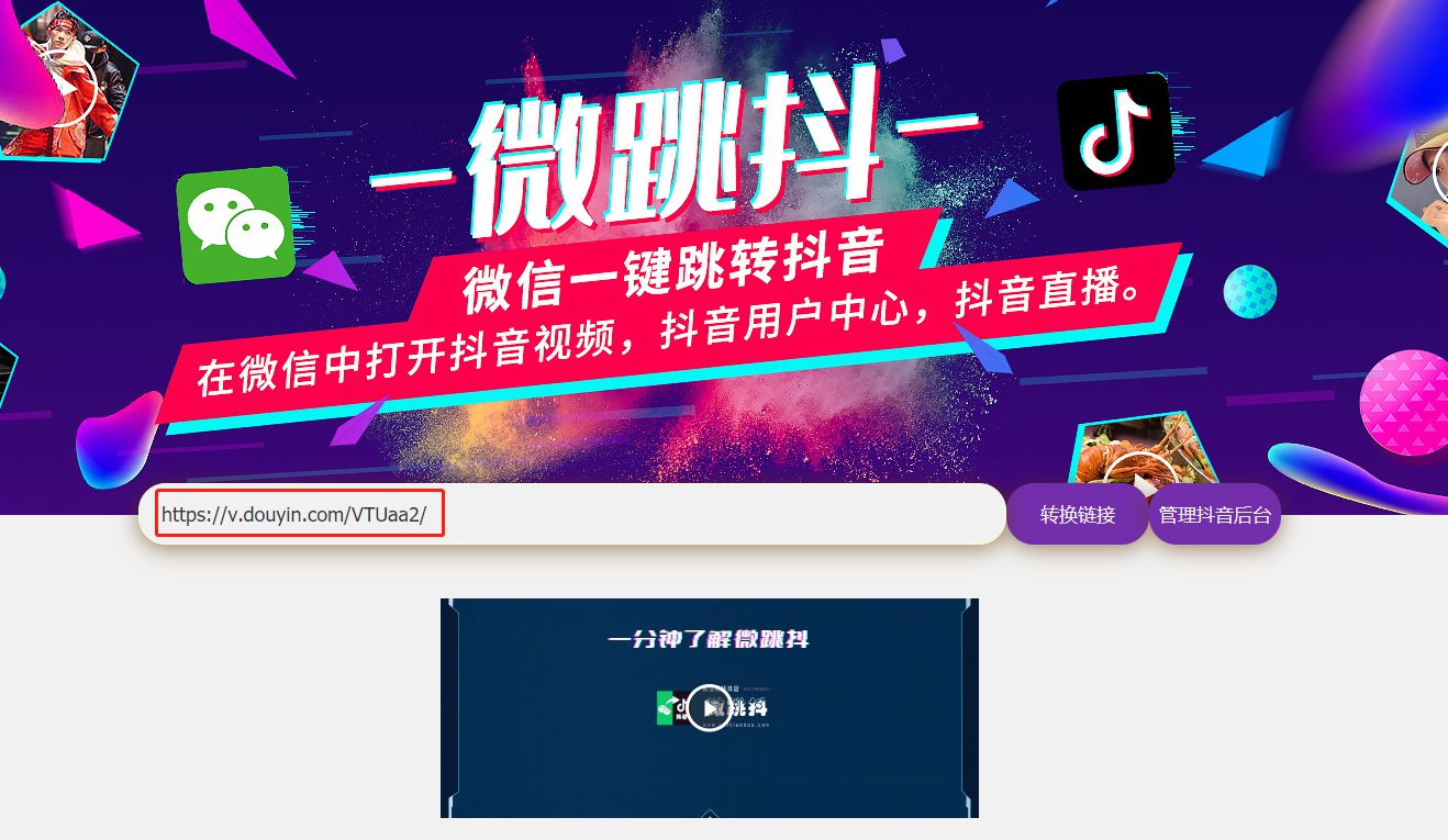 從瀏覽器進(jìn)入微信跳轉(zhuǎn)抖音轉(zhuǎn)換工具-微跳抖,。在輸入框里輸入抖音鏈接,點(diǎn)擊轉(zhuǎn)換網(wǎng)址之后,就會(huì)看到底部生成了自己的抖音賬號的二維碼和短鏈接了,支持抖音視頻頁,抖音用戶中心頁和目前大火的抖音直播的轉(zhuǎn)換。