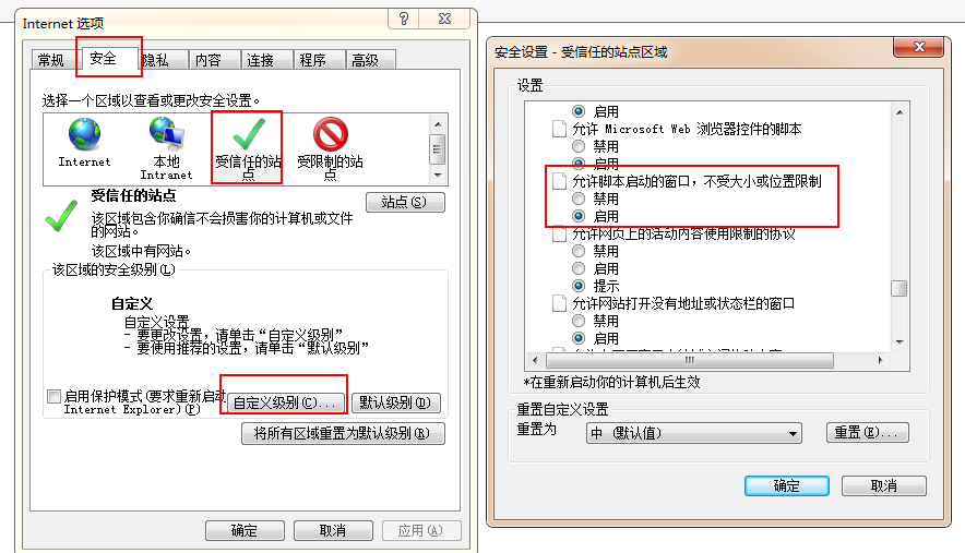 特別提醒:添加好了,設(shè)置自定義級別,找到[允許腳本啟動窗口,不受大小或位置限制]將啟用,建議(將所有項啟用),如下圖。