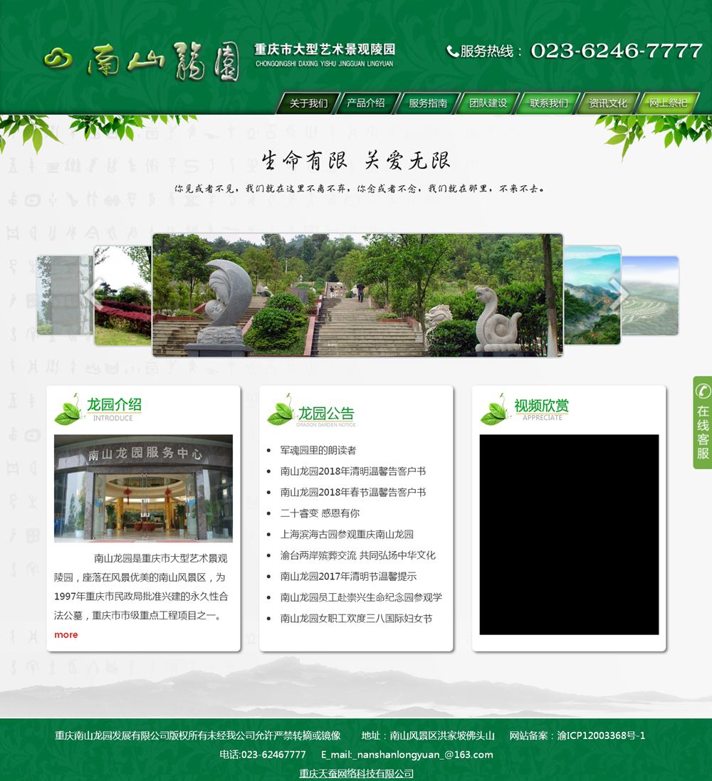 重慶南山龍園發(fā)展有限公司是重慶市大型藝術(shù)景觀陵園,座落在風(fēng)景優(yōu)美的南山風(fēng)景區(qū),為1997年重慶市民政局批準(zhǔn)興建的永久性合法公墓,重慶市市級(jí)重點(diǎn)工程項(xiàng)目之一。陵園背倚寶相莊嚴(yán)的佛頭山,龍脈逶迤,紫氣橫溢,前望視野開闊、山勢(shì)綿延。毗鄰千年古觀老君洞,與百花齊放的南山植物園相接,集自然之大美,著神明之光華,可謂鐘靈毓秀之寶地,超然世外之仙源。