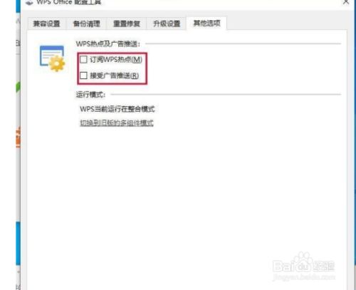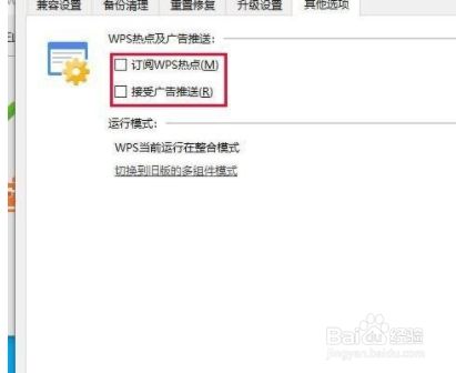 4、在WPSOFFICE配置工具界面中,我們點擊“其他選項”選項卡,就可以看到WPS熱點及廣告推送,我們將“訂閱WPS熱點”和“接受廣告推送”兩個選項的勾選去除,并確定即可。