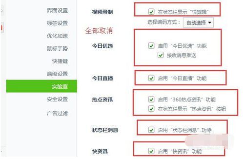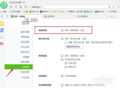 1、通過瀏覽器選項設(shè)置,設(shè)置其中的:實驗室,將不需要的推薦都取消勾選,如圖所示: