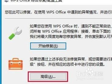 3、打開WPSOffice綜合修復(fù)和配置工具后,打開之后,我們點擊“高級”按鈕,如下圖所示。