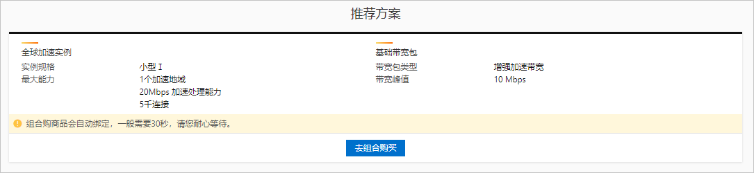 您可以根據(jù)系統(tǒng)推薦的購買方案,組合購買業(yè)務(wù)所需要的全球加速實例和基礎(chǔ)帶寬包。