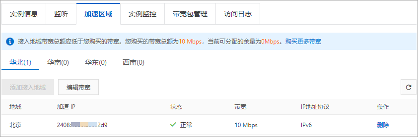 購買業(yè)務(wù)所需要的實例后,您便可以添加加速區(qū)域,指定IPv6客戶端所在地域并為其分配帶寬,同時獲得加速IP。