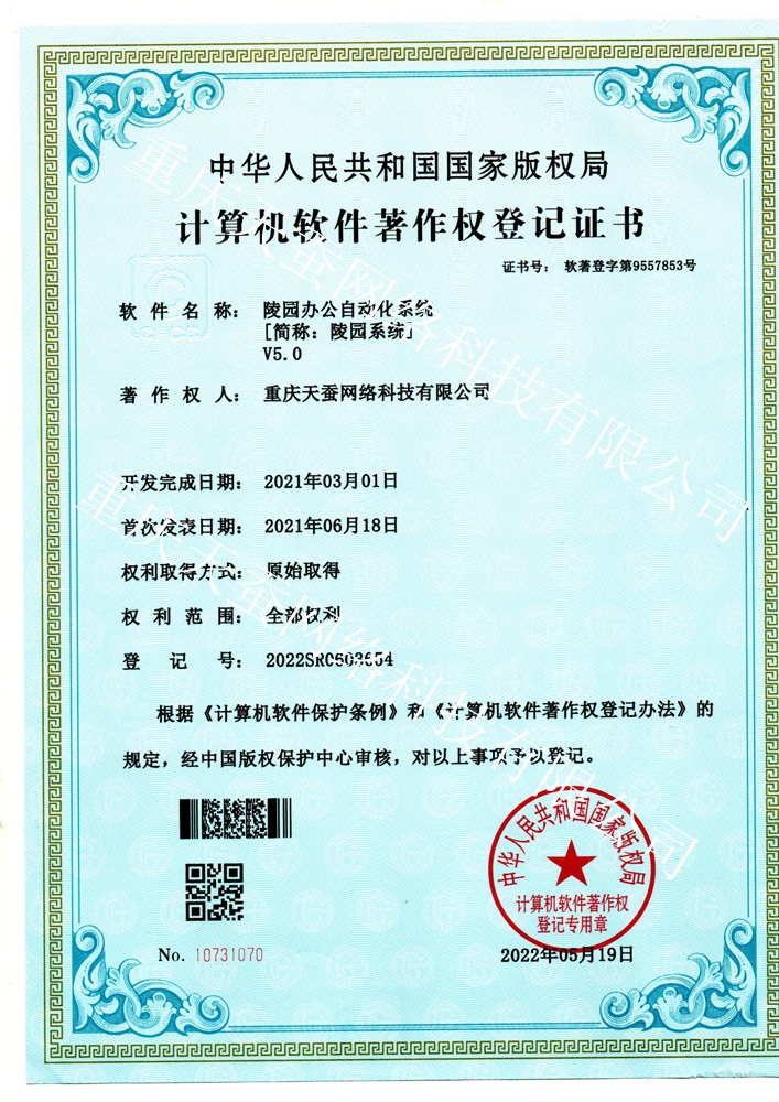 天蠶重慶軟件開發(fā)公司編者語:我司開發(fā)完成的自主知識(shí)產(chǎn)權(quán)“陵園辦公自動(dòng)化系統(tǒng) V5.0 簡(jiǎn)稱‘陵園系統(tǒng)V5.0’ ”(英文:Cemetery Office Automation Manage System V5.0,簡(jiǎn)寫COAMSV5.0:),陵園系統(tǒng)V5.0在2021年3月開始開發(fā),2021.6月開始發(fā)布,經(jīng)中華人民共和國(guó)國(guó)家版權(quán)局版權(quán)保護(hù)中心嚴(yán)格審核后,于2022年5月19日取得了《計(jì)算機(jī)軟件著作權(quán)登記證書》。