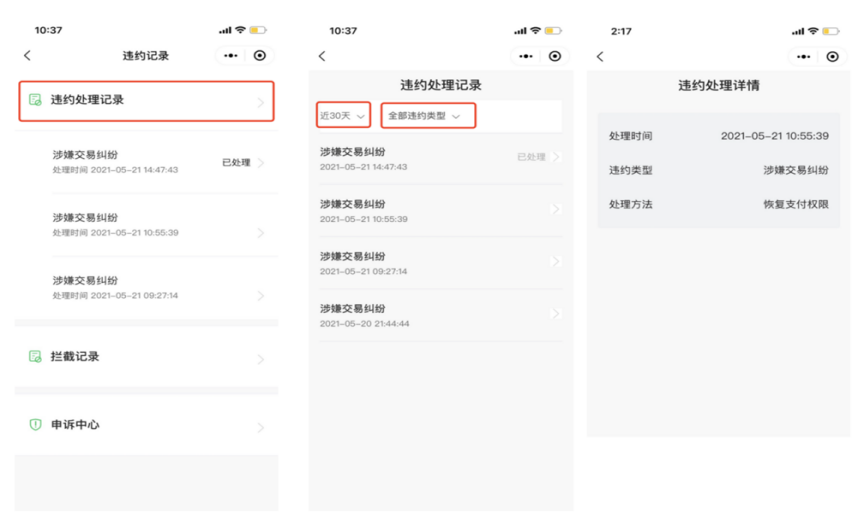 商戶可查詢近30天、近60天、近90天的違約處理記錄,也可以根據(jù)違約類型進(jìn)行查詢。點(diǎn)擊某一項(xiàng)可查看該條記錄的詳情信息。