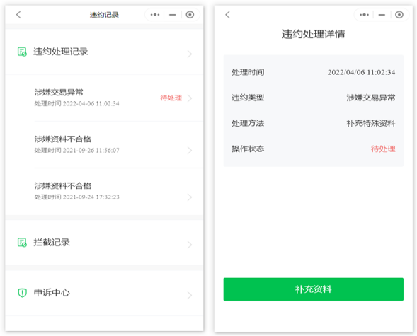 3、處理違約記錄,若違約記錄顯示“待處理”,請(qǐng)?jiān)谝?guī)定的時(shí)效內(nèi),根據(jù)具體的處理方法進(jìn)行提交資料,包括但不限于調(diào)單、整改、補(bǔ)充特殊資料。提交信息后,請(qǐng)耐心等待工作人員審核。