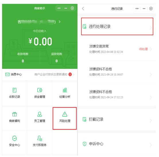 路徑:【微信支付商家助手】小程序->點(diǎn)擊首頁(yè)風(fēng)險(xiǎn)處理->違約處理記錄(待處理)