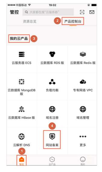 1. 手機(jī)登錄阿里云APP,單擊右上角的產(chǎn)品控制臺(tái),在我的云產(chǎn)品中單擊網(wǎng)站備案,進(jìn)入APP端的備案操作入口。