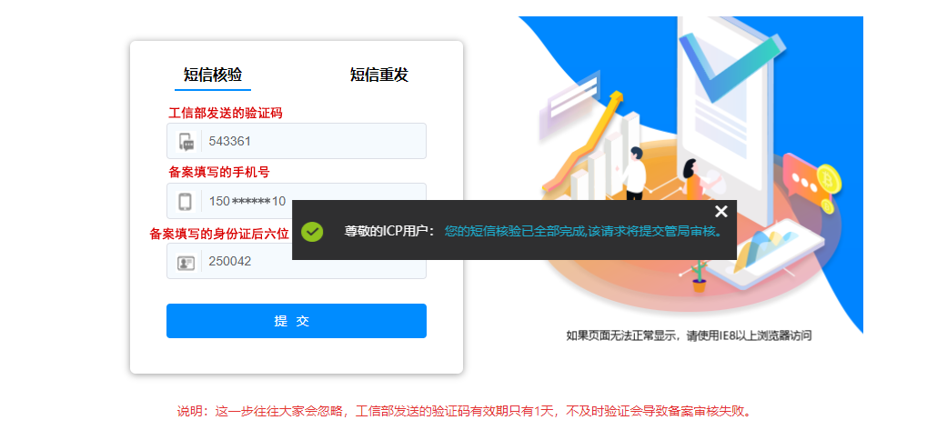根據(jù)工信部最新要求,自2020年8月17日起,各省市進(jìn)行備案申請(qǐng)時(shí)需通過工信部備案管理系統(tǒng)進(jìn)行短信核驗(yàn),需進(jìn)行短信核驗(yàn)的備案類型請(qǐng)參見需要短信核驗(yàn)的備案類型。